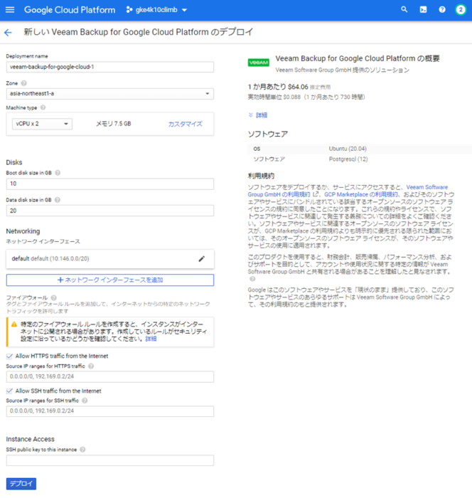 構成自体は推奨構成( 2 vCPU 7.5 GB RAMを持つn1-standard-2インスタンス )が選択されていますのでネットワークインターフェイスのみを指定し 、「デプロイメント」で進めます。