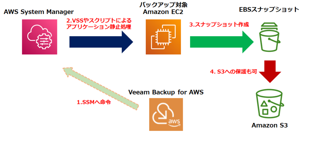 Veeam Backup for AWSを使用することで、Amazon EC2やAmazon RDS、Amazon EFS、Amazon VPCのデータ保護をエージェントレスに実施することができます。Amazon EC2の保護を行う場合には、EBSスナップショットとしてや、Amazon S3にバックアップすることが可能ですが、この際AWS Systems Manager(以下SSM)と連携することで、VSSやスクリプトによるアプリケーション整合性を考慮したバックアップを実施することも可能となっております。