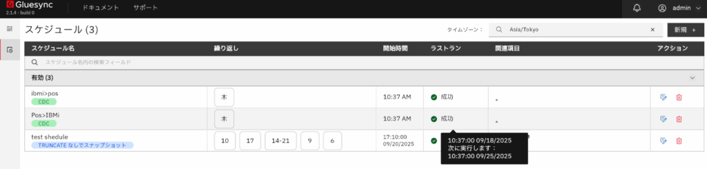 スケジュールの実行状況は簡易的には一覧画面で確認できます。ラストランのステータスをクリックすると、実行した日時と次回実行日時を確認可能です。