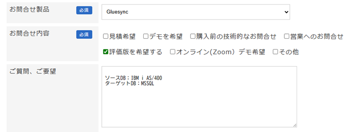この時「ご質問、ご要望」欄にてレプリケーションしたいDB構成をご記入いただくと、スムーズにご案内が可能です。