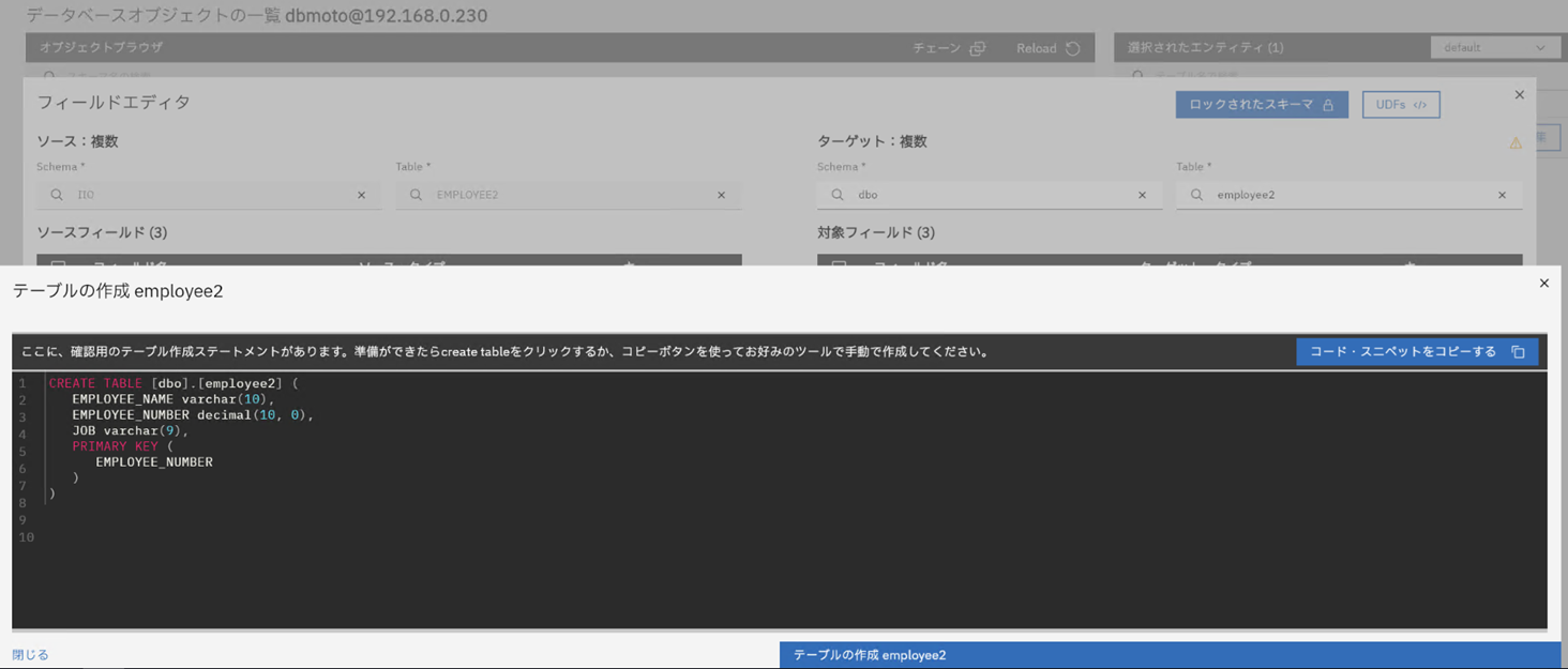 テーブルの作成をクリックすると、実際にターゲット側でCREATE SQLクエリが発行されます。