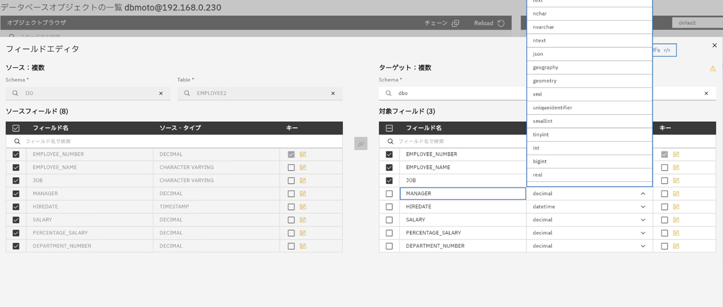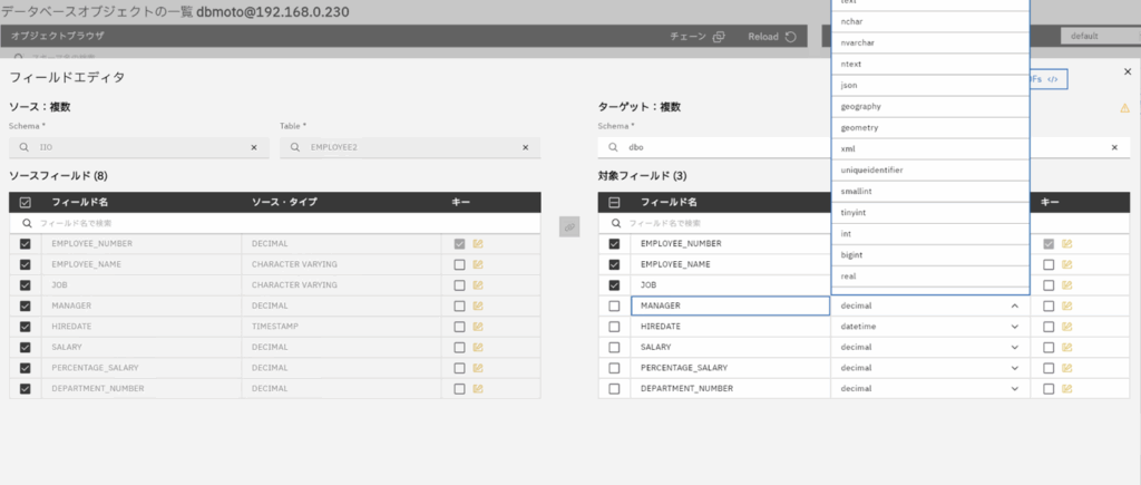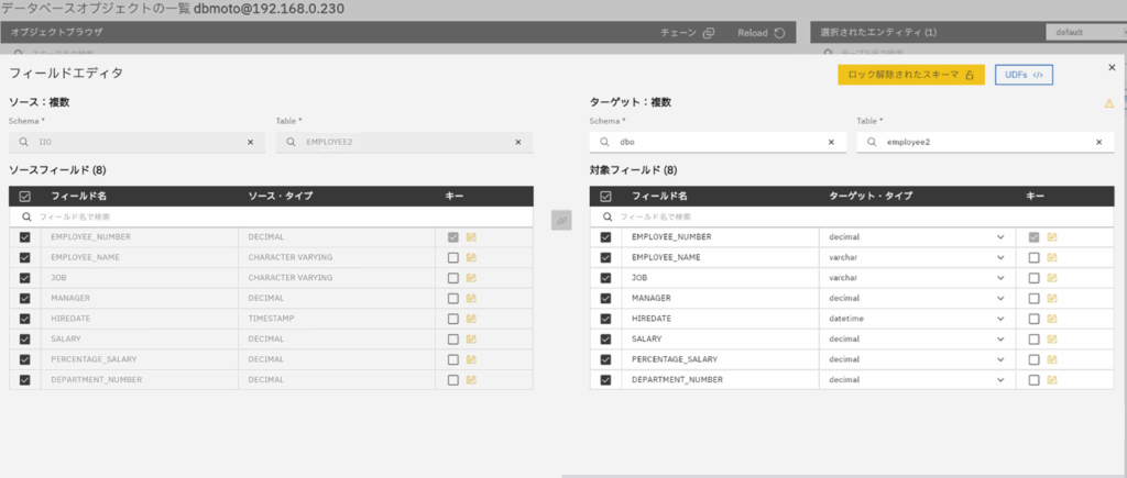 フィールドエディタ画面左がソーステーブル、右がターゲットテーブルを示しています。