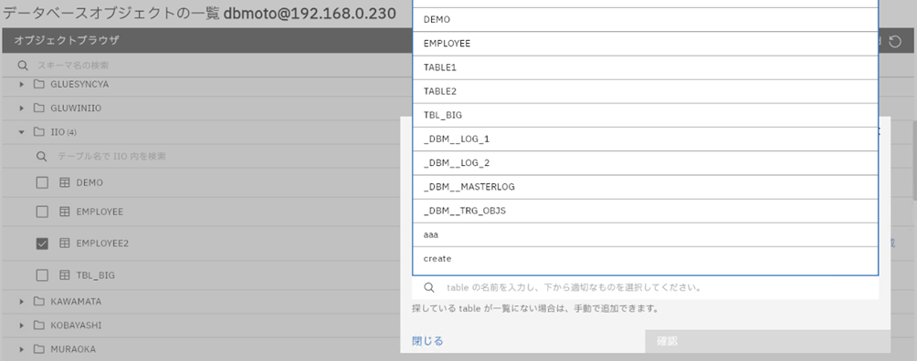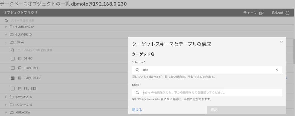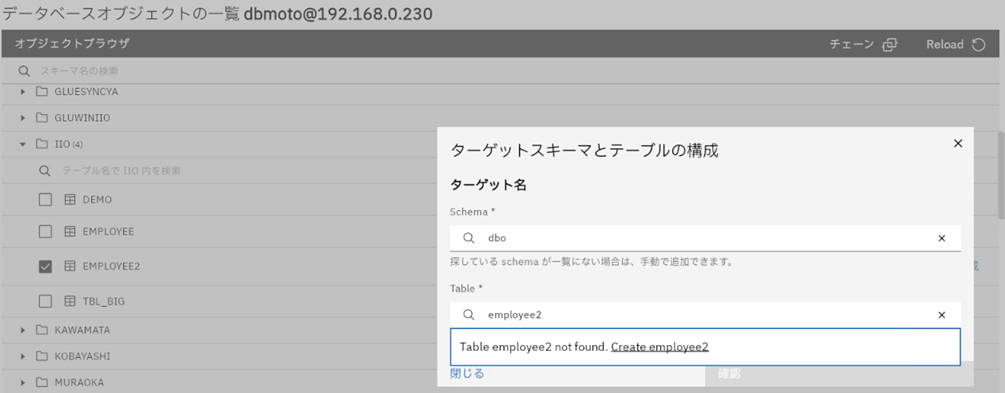 Table項目で、ターゲットスキーマ内には存在しない、作成したいテーブル名を入力すると、Table テーブル名 not found. Create テーブル名と出力され、クリックすることで追加のポップアップが出力されます。