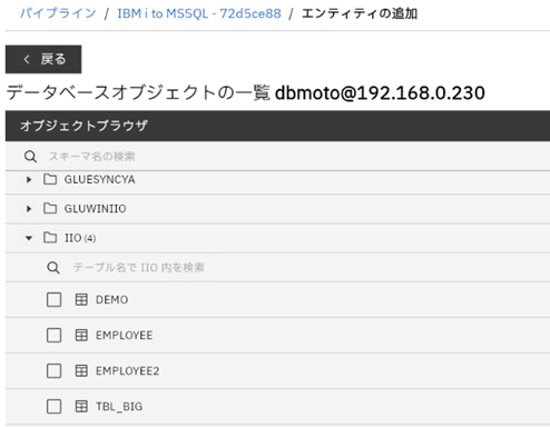 まず、ソース側のIBM i (AS/400)のIIOライブラリには4つのテーブルが存在し、この内EMPLOYEE2をレプリケーション対象とします。