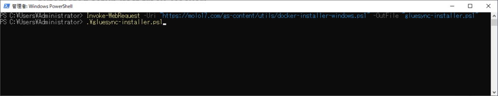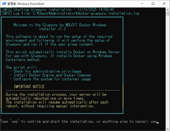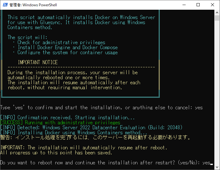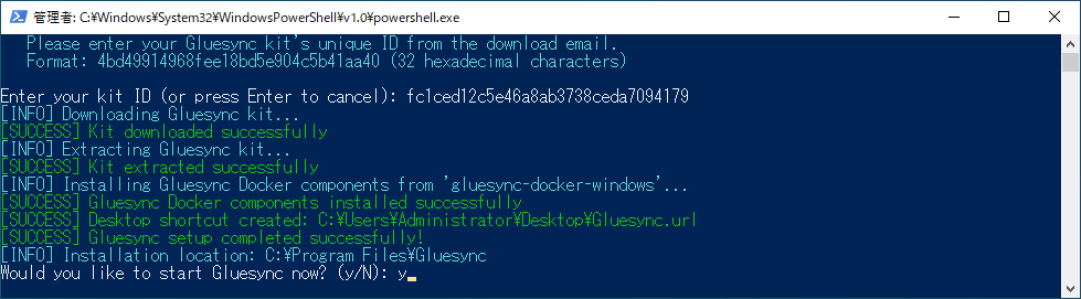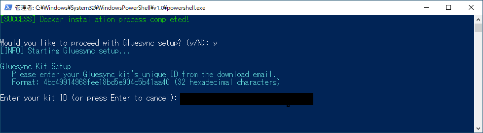再起動後にアクセスすると自動でPowerShellが起動し、インストールは継続されます。Dockerのインストールまで完了したら、Gluesyncのセットアップを続行するためにyを入力しEnter、キットIDを入力しEnter