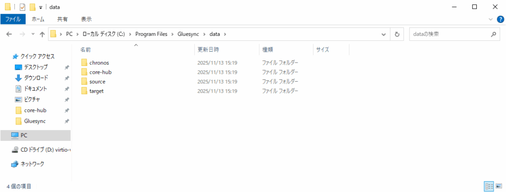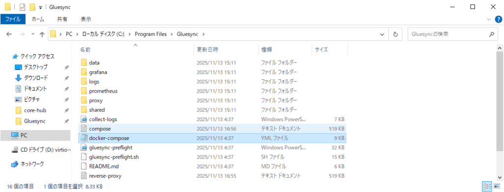 上記でインストールされたGluesyncのdocker-compose.ymlなどはC:\Program Files\Gluesyncに配置されており、各コンテナで保持するデータはC:\Program Files\Gluesync\dataに配置されています。