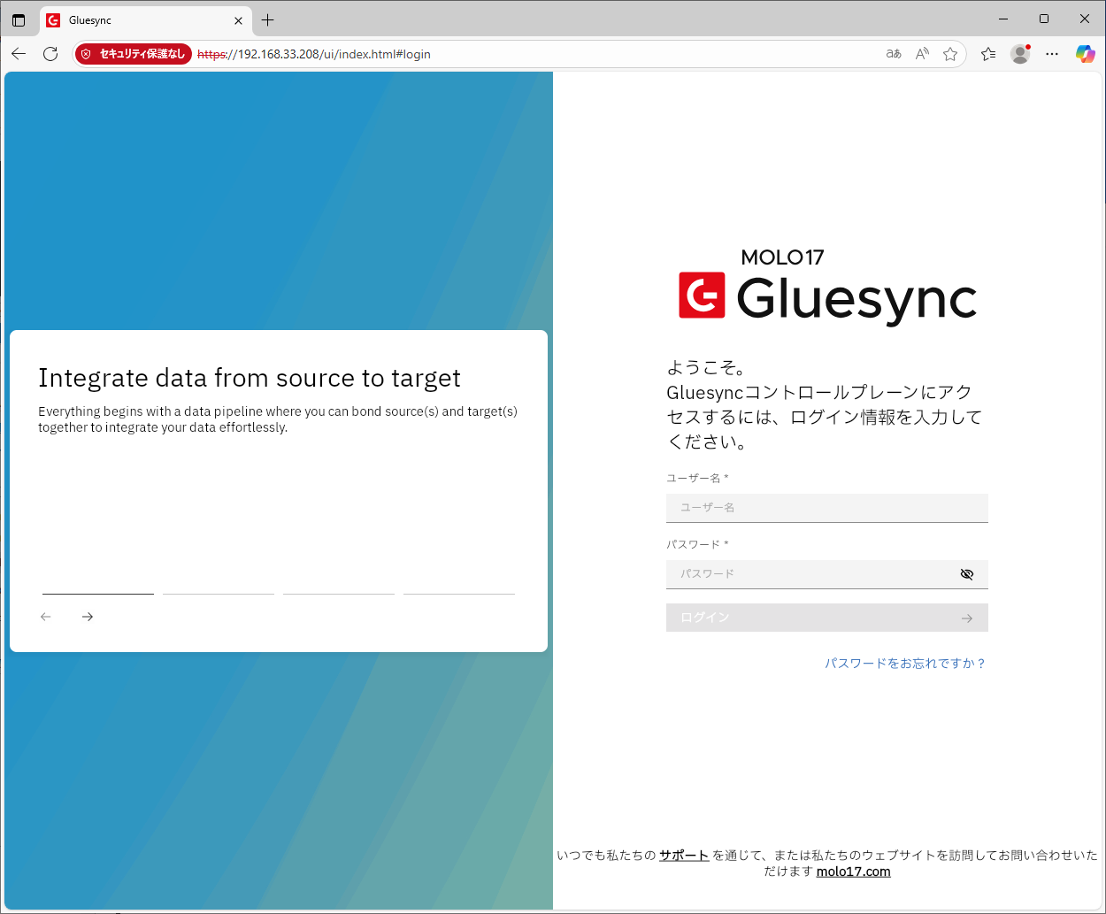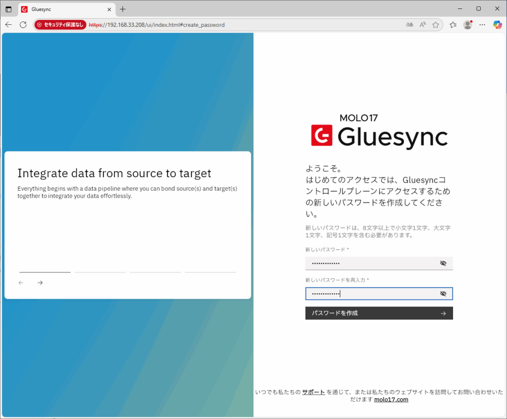 コンテナが正常に起動したらWeb UI(https://<IPアドレス>/)にアクセスし、デフォルトのユーザ/パスワード(admin/admin)でログインすると、パスワードの変更が求められるため、変更します。