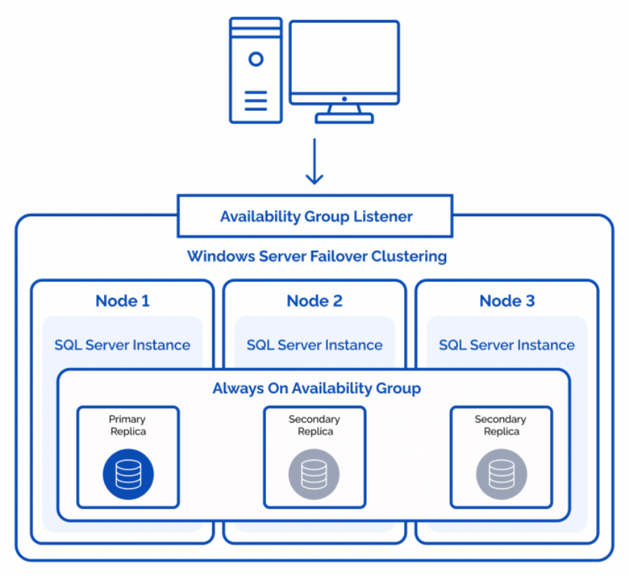 各レプリカは、独自のWSFCノード上にある個別のSQL Serverインスタンスです。プライマリがすべての読み取りと書き込みを処理します。セカンダリはプライマリからトランザクション ログ データを受信し、同期を維持するために適用します。従来のデータベース ミラーリング設定のような監視者ロールは存在せず、クォーラムは完全に WSFC によって処理され、レプリカをホストしているかどうかに関係なく、クラスター内のすべてのノードが参加します。
