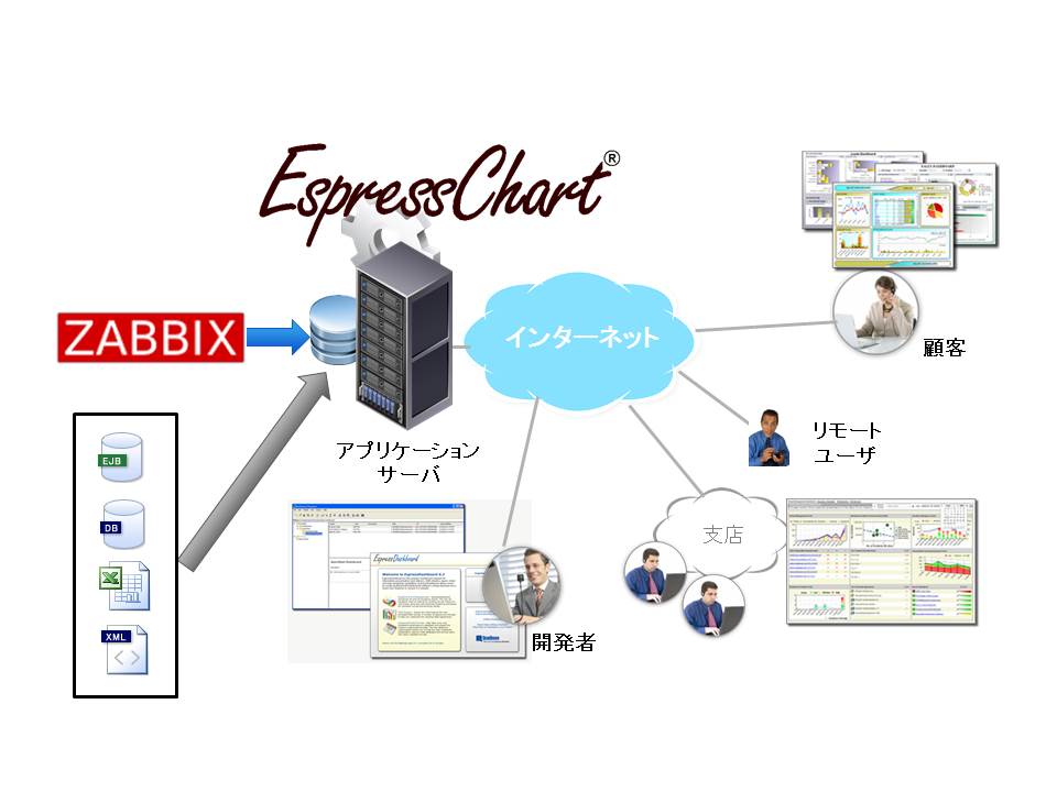 EspressChartはwebベースの製品ですので、これにより、既存の監視ポータルサイトにZabbixによる監視結果をEspressChartを使ったわかりやすいチャートとして組み込むことが可能です。