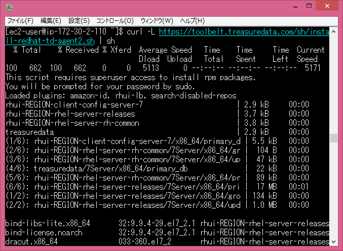 OSはRHEL 7.2を使用しています。インストールは次のコマンドを実行します。RPMリポジトリにシェルスクリプトが登録され、RPMパッケージがインストールされます。詳細については、こちらをご参照ください。