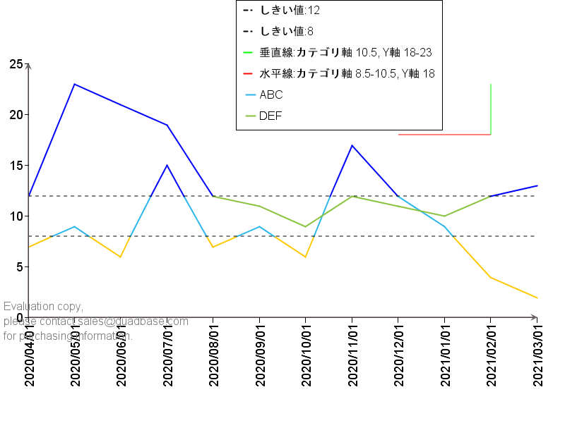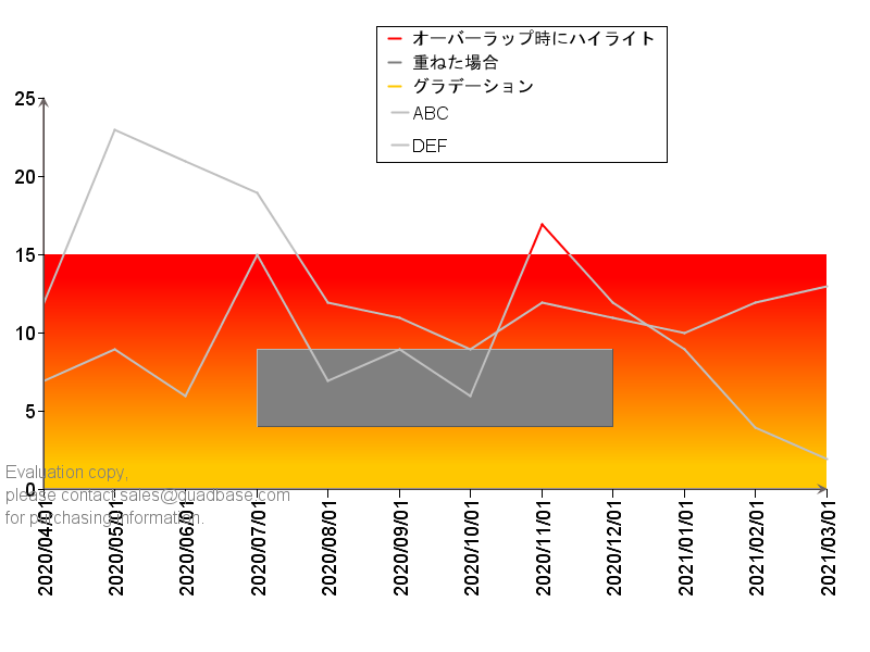 Y軸の値とカテゴリ(X)軸の値から特定範囲ControlRangeを作成できます。複数の範囲を作成し、重ねるための設定や、範囲内の重なったチャートプロットをハイライトすることが可能です。