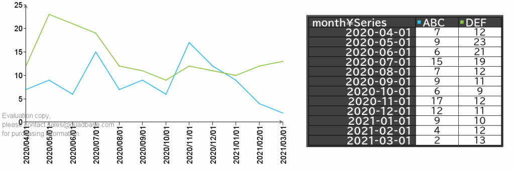 { "DEF","2021-02-01","12" }, { "DEF","2021-03-01","13" },