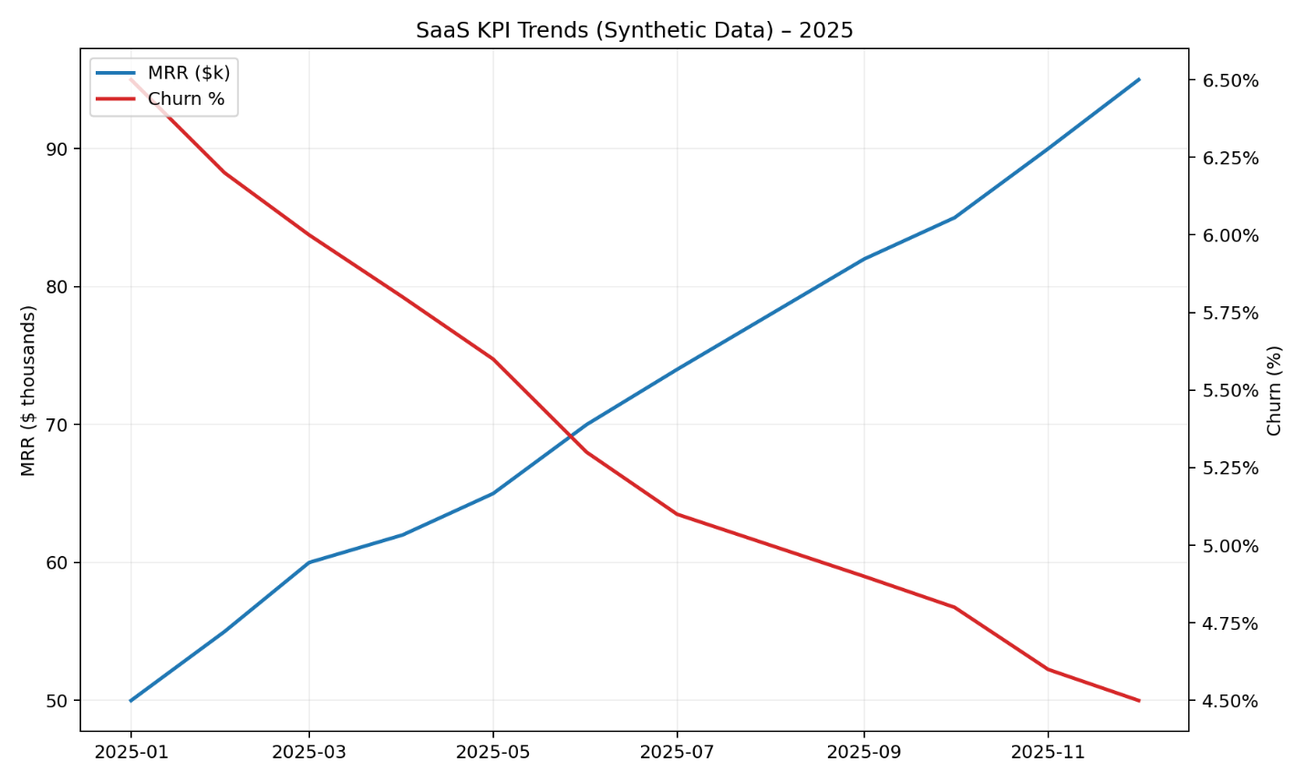 月次継続収益(MRR): サブスクリプションビジネスの核心的な成長指標。収益とキャッシュフローを予測するための傾向を追跡する。