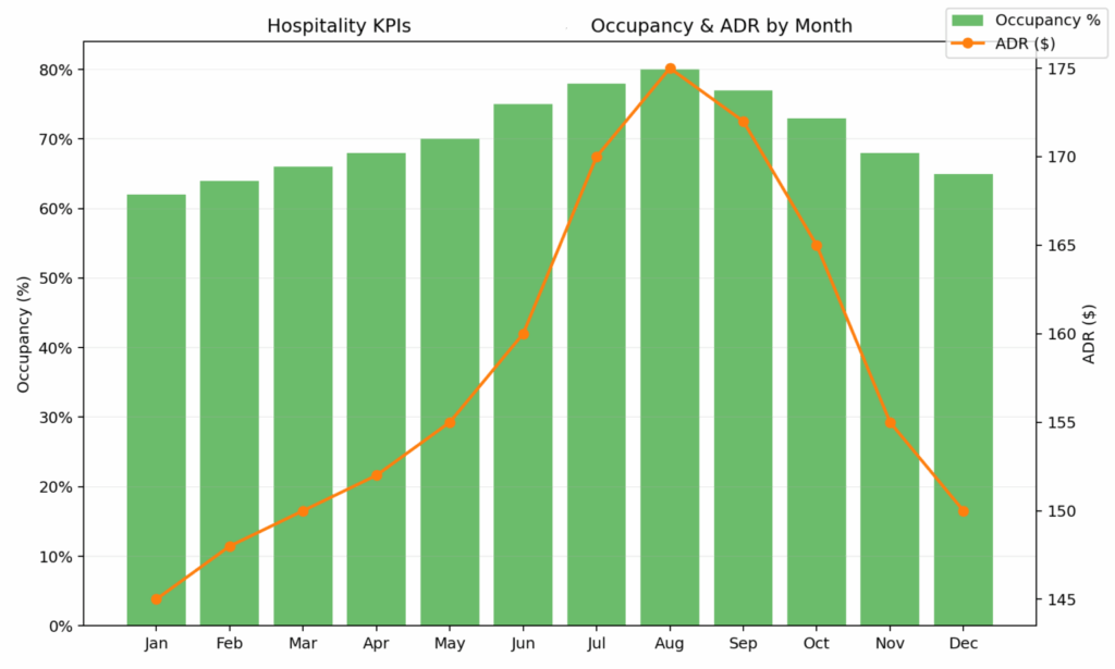 ●ホテルの収益性向上を目指す場合、KPIには稼働率、平均客室単価(ADR)、利用可能客室当たり収益(RevPAR)が含まれます。