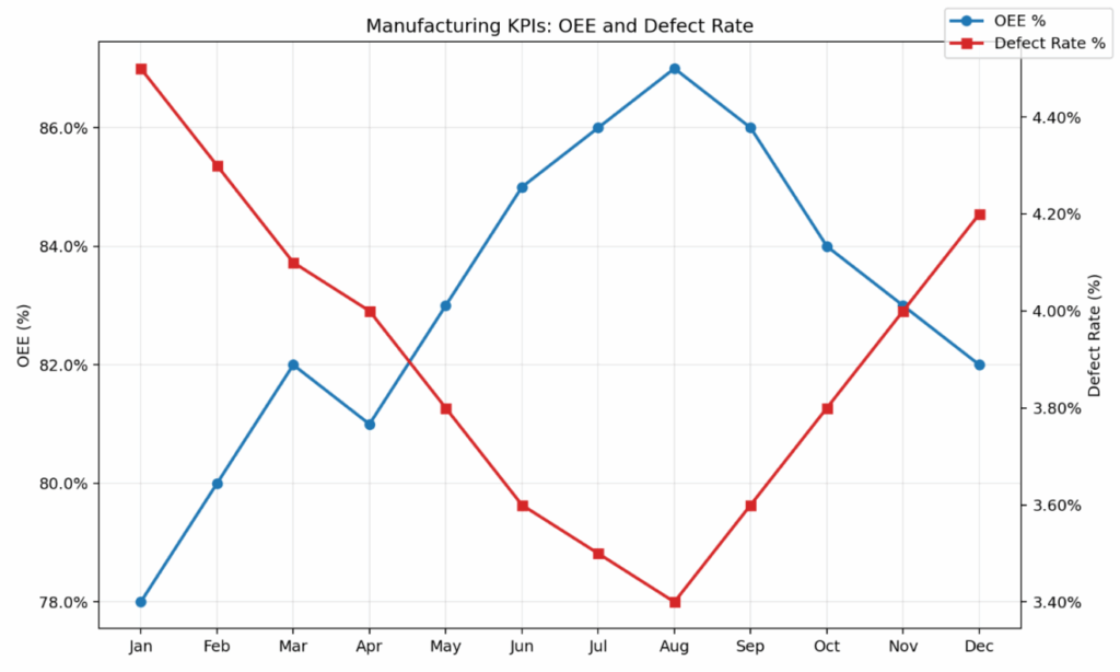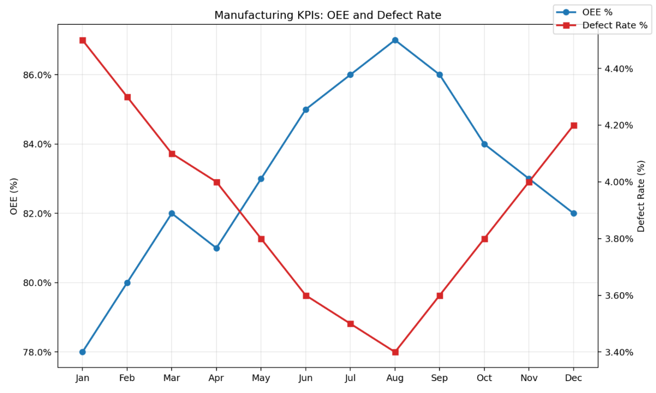 行動指針: OEEが85%を下回った場合、ダウンタイム、サイクルタイムの遅延、または品質問題を分析してください。パレート図を使用して、主要な欠陥原因を特定します。