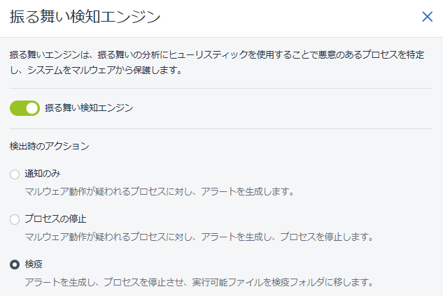 「振る舞い検知エンジン」の設定はシンプルに制御することができます。デフォルトで有効化されています。検出時のアクションは、通知のみかプロセスを停止させるか、検疫フォルダへ隔離するといったアクションを設定できます。