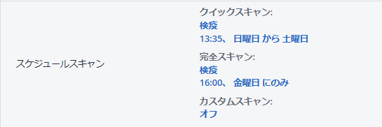 「スケジュールスキャン」設定ではマシンのシステムファイルのみをスキャンするクイックスキャン、マシン上のすべてのファイルをスキャンする完全スキャン、設定した任意のファイルをスキャンするカスタムスキャンを設定できます。