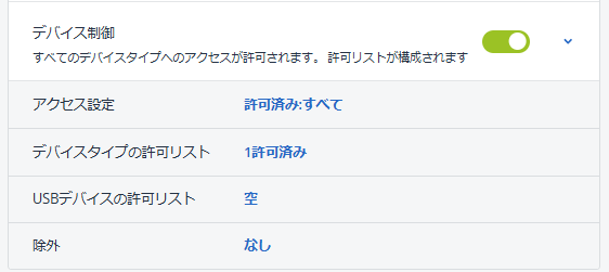 「デバイス制御」機能を有効化すると、アクセス設定やデバイスタイプの許可リスト、USBデバイスの許可リスト、除外するデバイスを設定することができます。