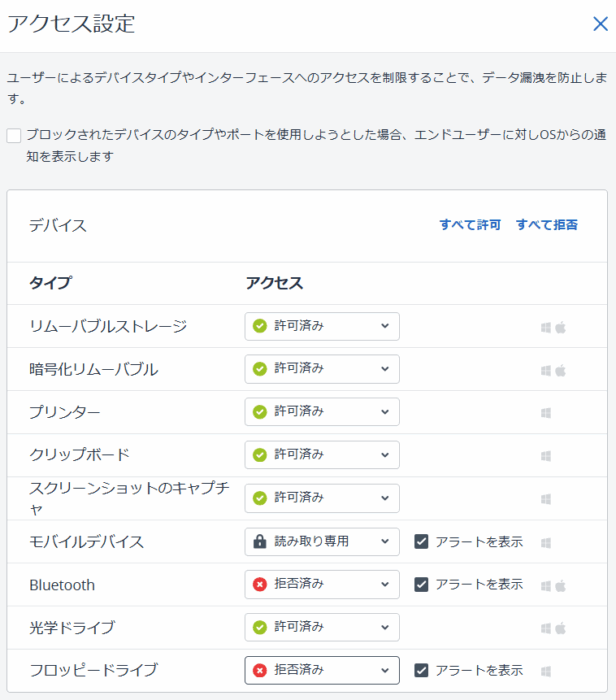 アクセス設定では、どのデバイスのアクセスを制御するか設定できます。各デバイスを許可するか、読み取り専用か、拒否するかを選択します。