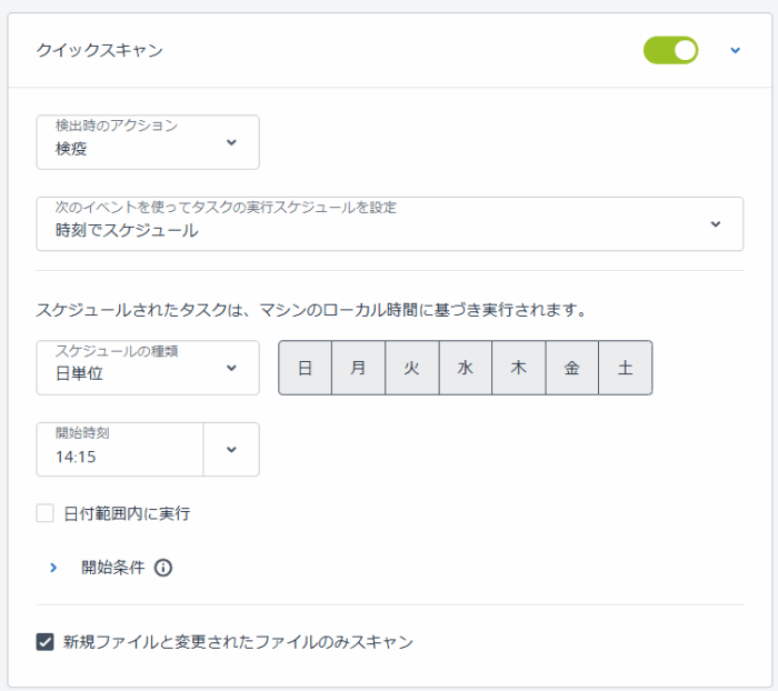 スキャン時の設定は細かく設定することができ、検出時には検疫するか、通知のみにするかアクションを選択できます。スキャンの実行タイミングは時刻によるスケジュール以外にもシステムにユーザがログイン時やログオフ時、システムの起動時やシャットダウン時など、幅広く実行スケジュールを調整することができます。