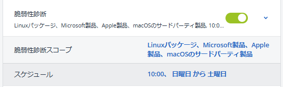 保護計画で設定する際には、「脆弱性診断」を有効化します。対象のマシン上のソフトウェアを自動的にスキャンするようになります。Windowsマシン、masOSマシン、Linuxマシンの脆弱性診断スコープの対象を選択します。