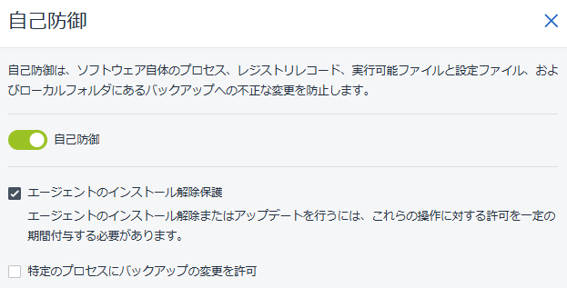 「自己防御」機能はデフォルトで有効化されています。「エージェントのインストール解除保護」を有効化していくことで、管理者の許可なしにエージェントをアンインストールできなくなります。ランサムウェアや内部不正によるエージェント削除操作を防ぐことが出来ます。自己防御は一度設定してしまえば、常時有効に動作し、運用時の負担を増やすことなく、マシンの安全性を高めます。