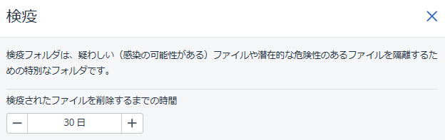 「検疫」の設定では隔離されたファイルを削除するまでの保持期間を指定できます。デフォルトでは30日間保存され、その後自動的に削除されます。保持期間は自由に調整可能なため、短くして疑わしいファイルは早めに削除したり、長めに設定し詳細調査を行う、といった運用方針にあわせて選択できます。