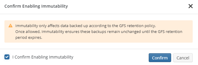 確認メッセージが表示されます。内容を確認し、「不変性の有効化を確認します」チェックボックスにチェックを入れ、「確認」をクリックしてください。