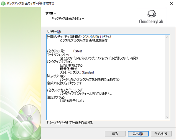 バックアップ計画の設定後、概要を確認し必要に応じて設定を修正します。次へをクリックするとバックアップ計画の作成が完了します。