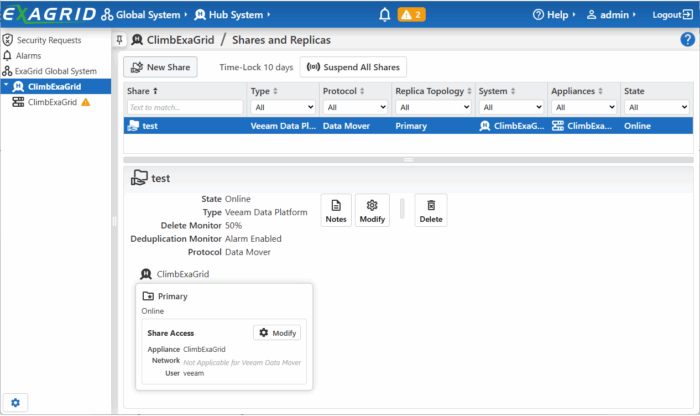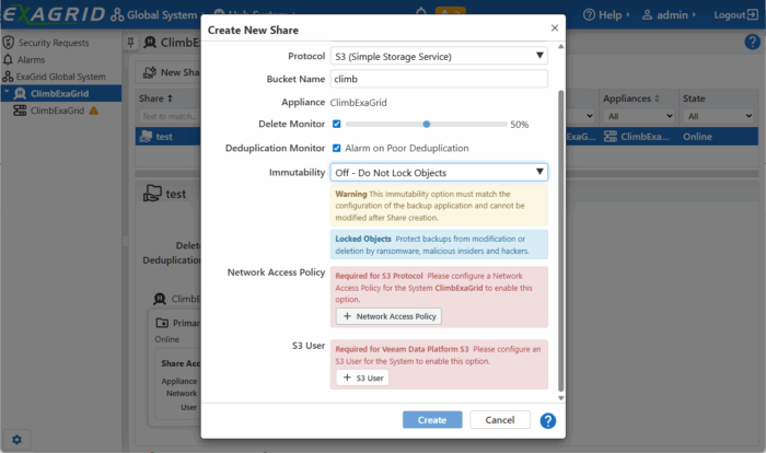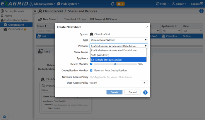 1.ExaGridのコンソールからShares and Replicasを開き、New Shareからフォルダの新規作成を行います。
