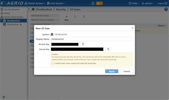 Display Nameを指定します。Veeamに登録する際には、表示されたAccess KeyとSecret Keyを使用します。