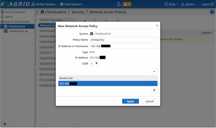 Policy NameとIP Address or Hostnameを入力し、Applyを押してNetwork Access Policyを作成します。