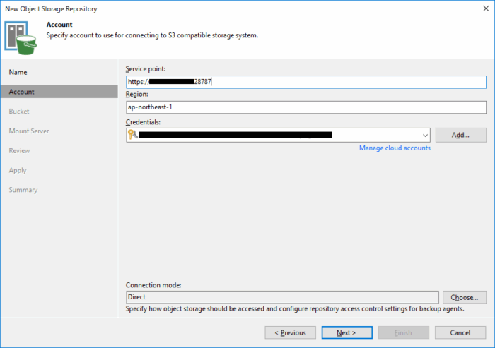 4.Accountステップでは、Service point、Region、Credentialsを設定します。