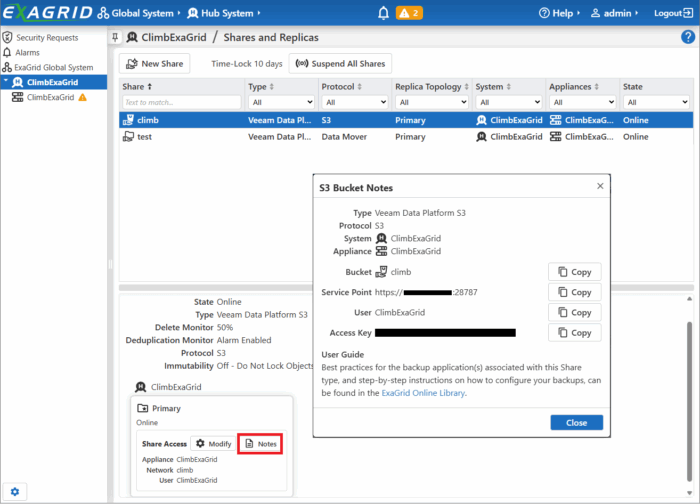 Service pointはExaGridコンソールのShares and Replicasから対象のフォルダのNotesから確認可能です。