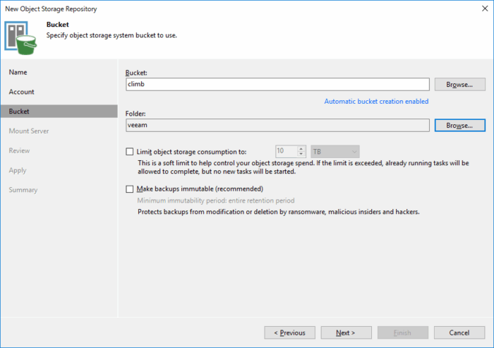 5.Bucketステップでは保存先のBucketとFolderを指定します。不変性設定をする場合は、Make backups immutableを有効化します。