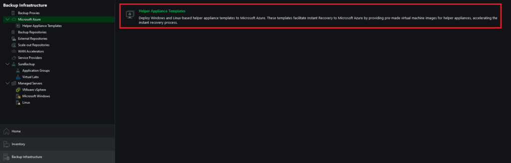 VeeamコンソールのBackup Infrastructureビュー > Microsoft Azureと進み、Helper Appliance Templatesをクリックするとウィザードが開始されます。