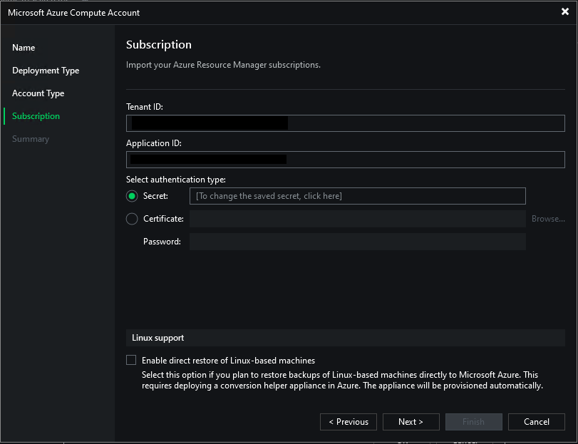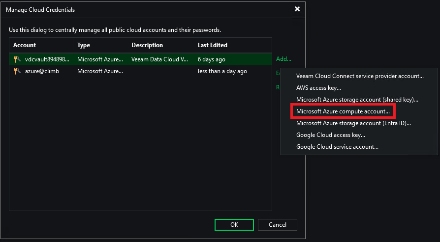 v12の手順と変わりません。Veeamコンソールのメインメニュー > Credentials & Passwords > Cloud Credentialsと進み、Addから「Microsoft Azure compute account」を選択してAzureサブスクリプションを登録します。