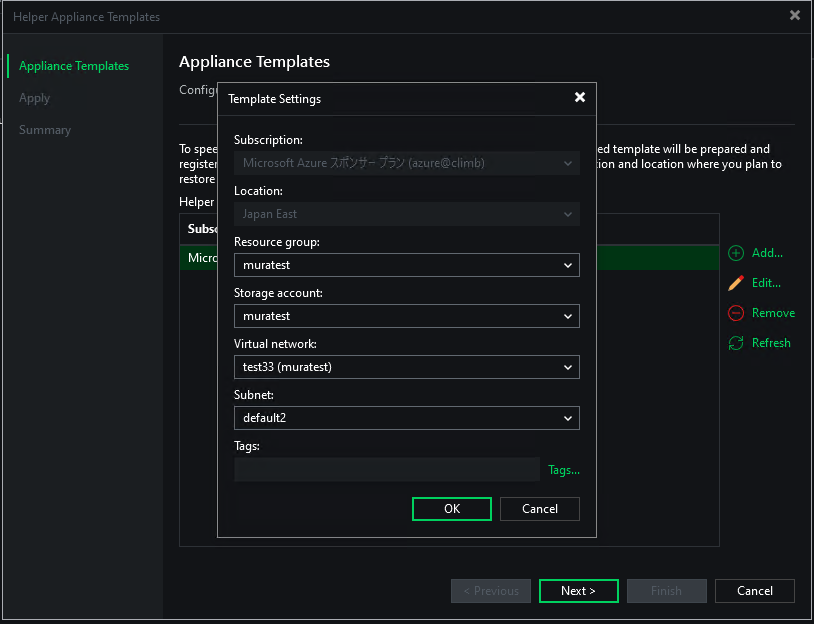 ※リソースグループ/ストレージアカウント/仮想ネットワークはVeeamから新規で作成することも可能です。