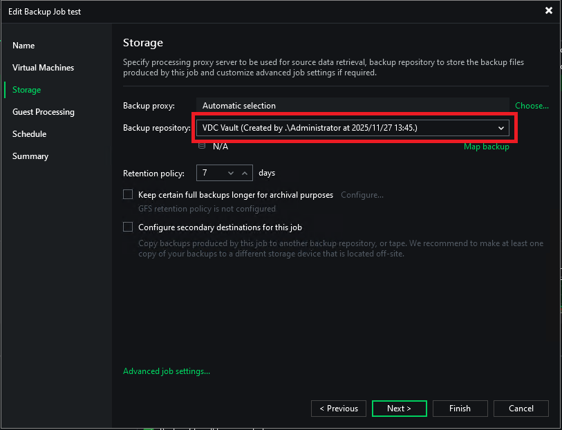 今回はvSphere上のWindows 2016マシンをAzureへリストアしていきますので、Windows VMをVeeam Data Cloud Vaultへバックアップします。