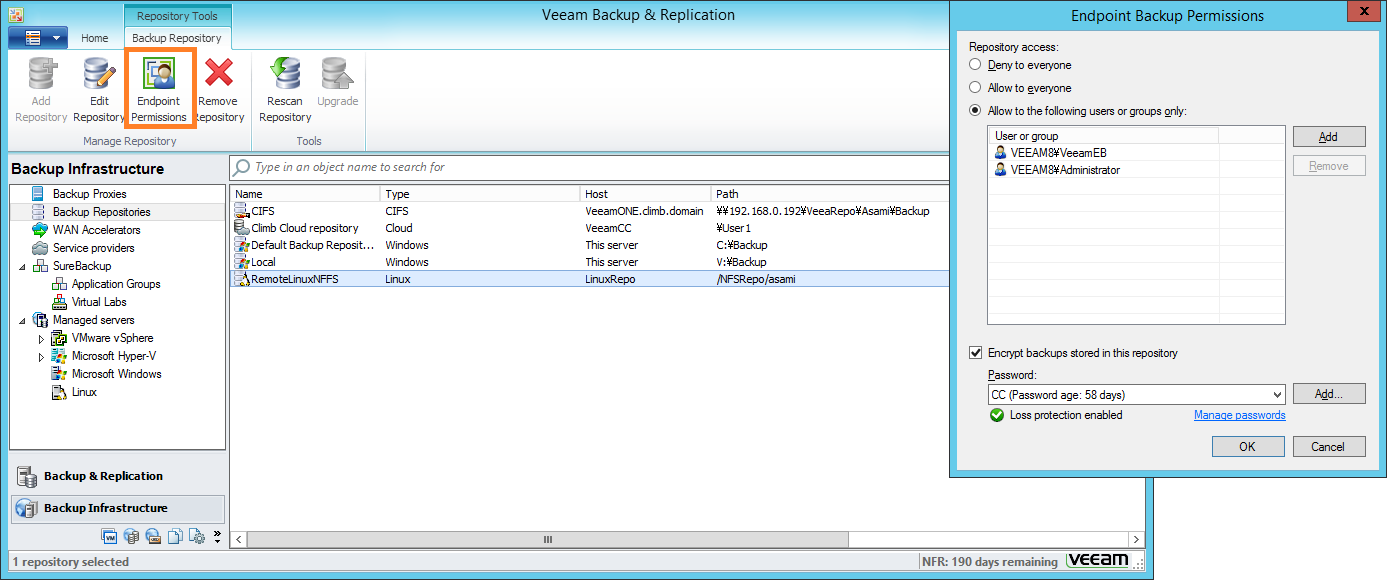 リポジトリをVeeam Endpoint Backupのターゲットとして使用するための準備として、Veeam Backup & Replicationから、そのリポジトリに対する権限とEndpoint Backupのバックアップを保存する際に暗号化を行うか設定します。