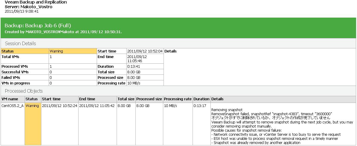Veeam Backup & Replication(※以下Veeam)を使用して仮想マシンのバックアップ、レプリケーションのJobを終了時に下記のようなメッセージがHTMLのレポートに記載される場合があります。