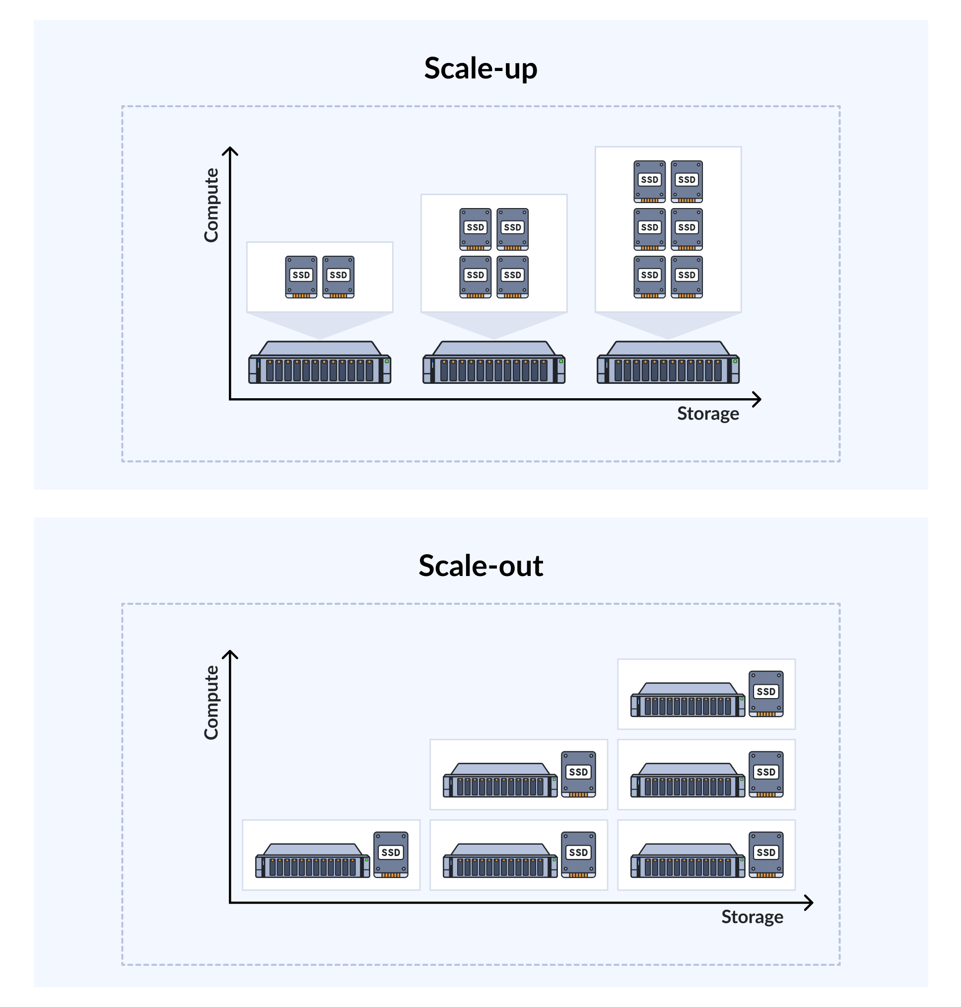 • ハイブリッドスケーリング:このアプローチでは、コンピューティングリソースはスケールアップ(垂直拡張)が可能でありながら、ストレージはスケールアウト(水平拡張)が可能です。