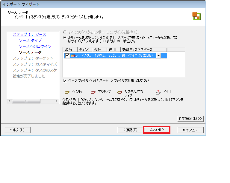 移行対象のディスクの選択画面