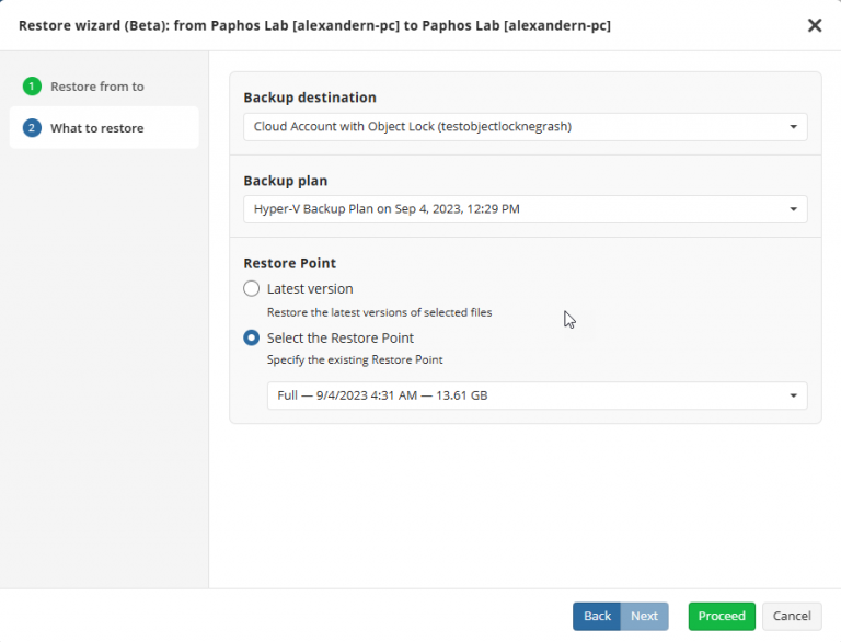 元のマシンが利用できない場合でも、インターフェースの異なる部分間を切り替えることなく、同じガイド付きフローを通じて別のローカルマシンへの復元を設定できます。