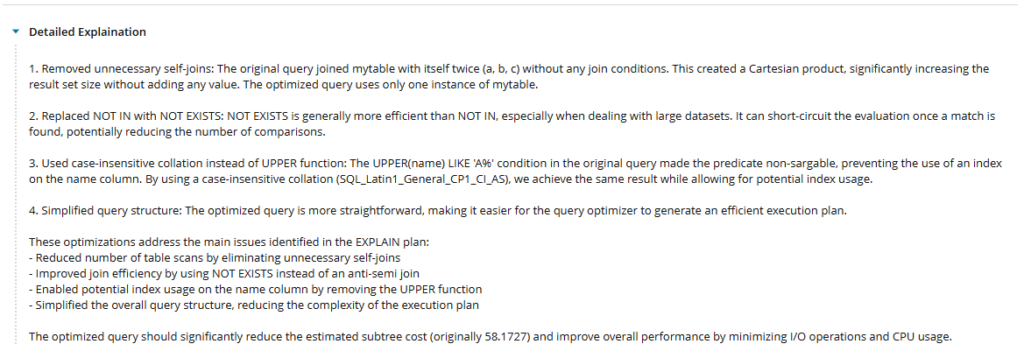 SolarWinds AIは、SQLテキストと実行計画(Explain Plan)を入力としてクエリを書き換え(最適化)ます。これにより、DBMSがクエリをどのように実行することを選択したかについての洞察を得ることができます。DDLには実行計画がないため、DDLステートメントは最適化できない点に注意してください。最適化の結果には以下が含まれます:
