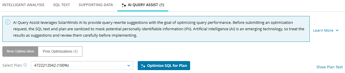 - [プランの SQL を最適化] ボタンをクリックします。これにより、SolarWinds AI に最適化リクエストが送信されます。処理完了まで数秒から数分かかる場合がありますが、これは主にクエリの複雑さに依存します。