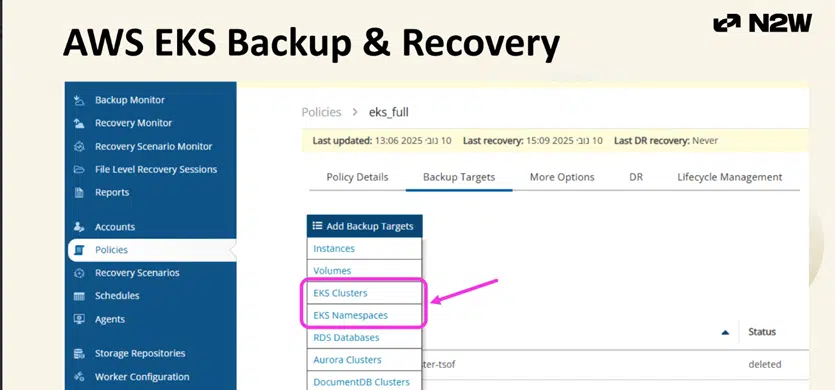 N2WSは、AWS EKS上で動作するKubernetes環境向けにポリシー駆動型のバックアップと復旧を提供し、データだけでなくKubernetesの完全な状態を保護するように設計されています。これにはネームスペースやクラスターも含まれ、チームがアプリケーションを元の状態(単なるストレージではなく)で復旧できることを保証します。