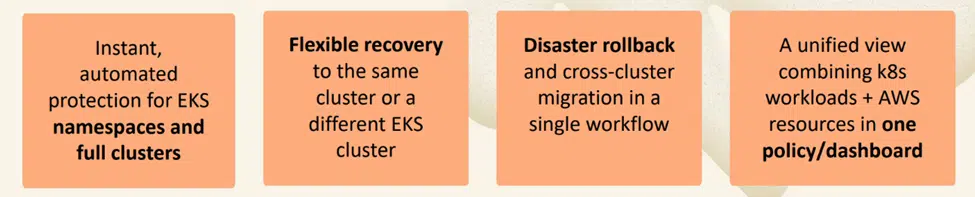 ●自動化されたEKSバックアップと復旧(ネームスペースまたはフルクラスター対象)、アプリケーションを意識した一貫性のあるスナップショット