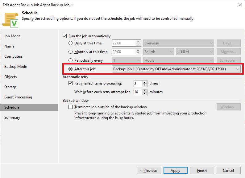 Veeam Agent for LinuxをVeeam Backup & Replicationで統合管理し、VeeamコンソールでAgentジョブを作成することで、他ジョブのあとに実行するよう設定が可能です。