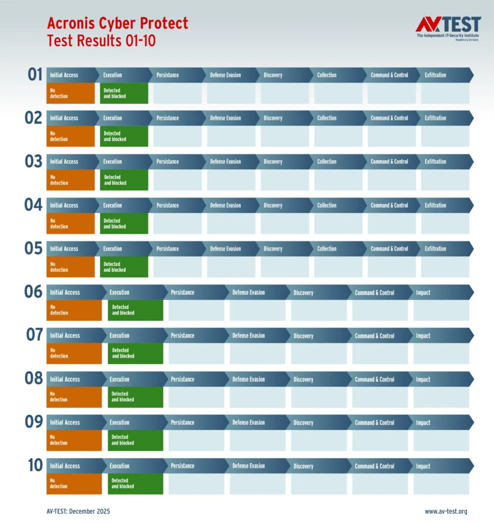Acronisは優れた結果で保護スコア要件を満たしたものの、テスト対象の特定製品はAV-TESTの定期的な公的認証シリーズの対象外でした。このため、Acronisは今回のATP評価において正式な認証称号を取得していません。